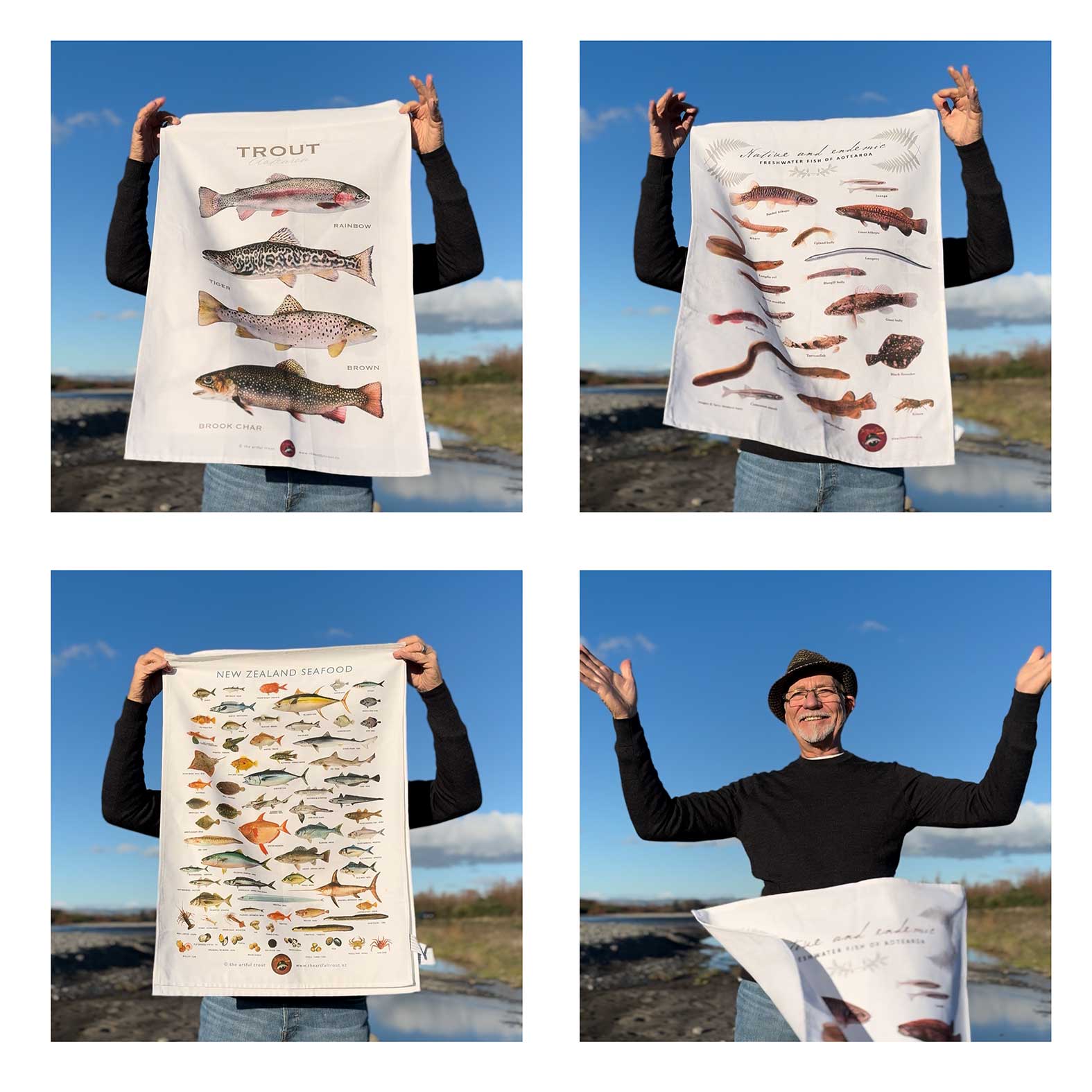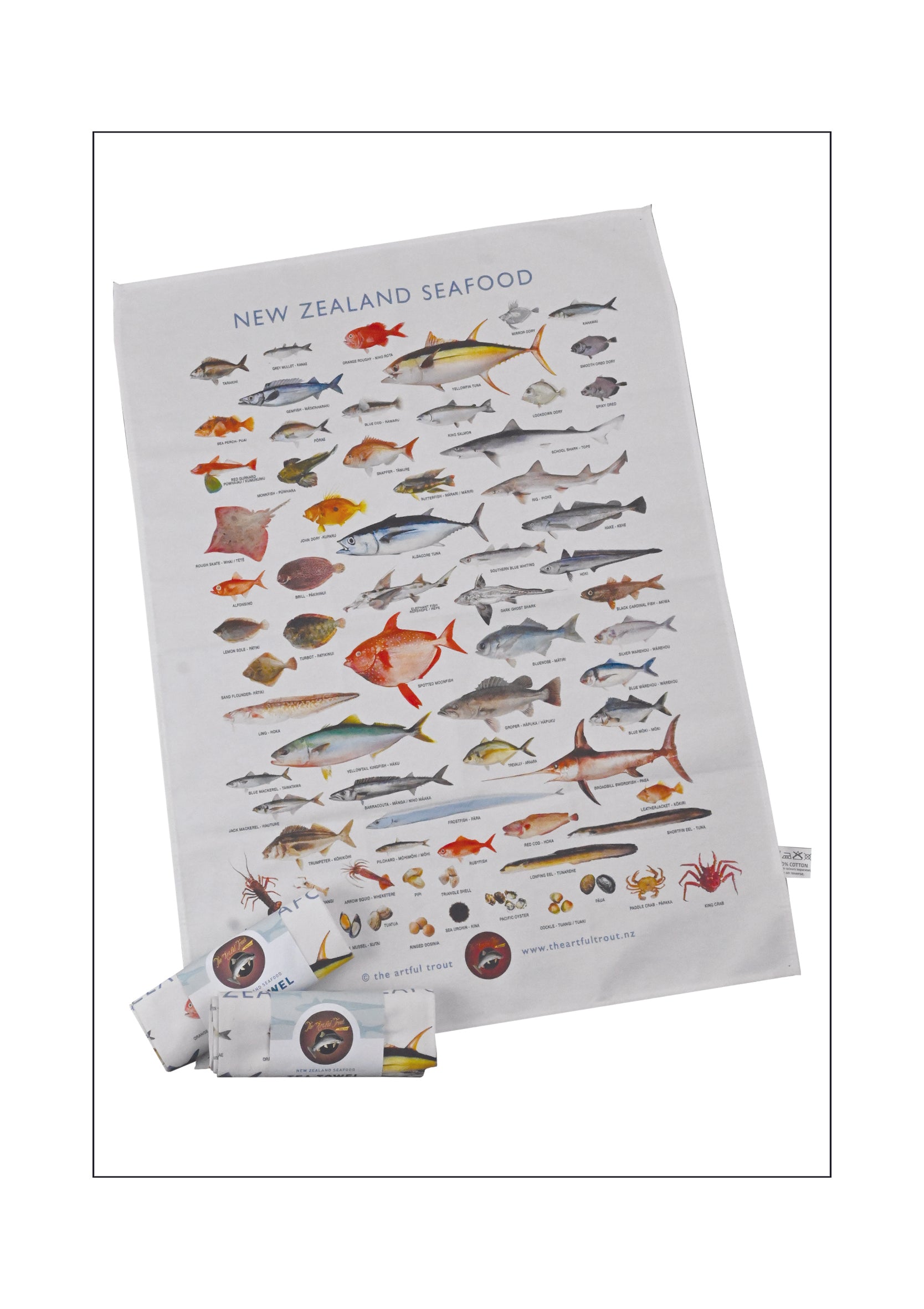 All three of the Artful Trout teatowels at a special bundle price. All three for the price of two. Including the iconic NZ seafood poster image, Popular NZ Trout and Native fish of Aotearoa. Good quality 100% cotton.
